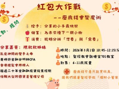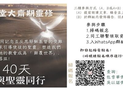 各位親愛的弟兄姊妹, 按照教會年曆的傳統,復活節主日往前推四十日(主日不算在内)的星期三稱為“聖灰星期三”(Ash Wednesday),從這日開始到復活節主日前,我們稱爲“大齋期”(又作“四旬期”或“預苦期”)。 今年大齋期從2月18日開始,教會選擇了靈命日糧事工製作的《40天與聖靈同行》,邀請弟兄姊妹透過朗讀、聆聽、回應的方式(每天5分鐘),一同記念並反思耶穌基督的受難與復活。 祈求引導使徒的聖靈,塑造我們每一位,成爲祂的器皿,使祂的教會成爲「 顛覆世界」、祝福世界的管道! 主題一:自省與悔改 第 1 日:你期待著什麼? 第 2